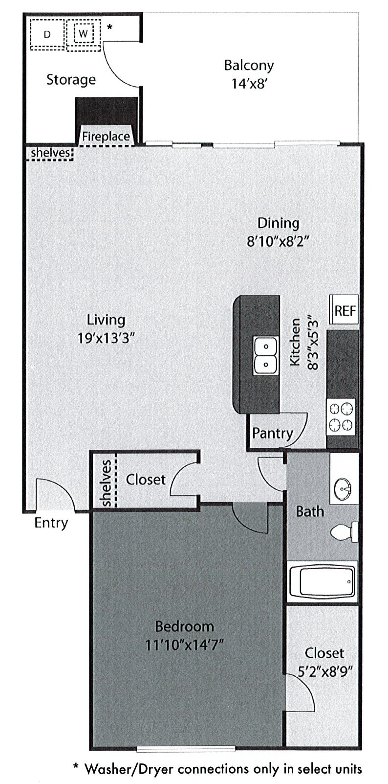 This is our one bedroom, one bathroom floorplan with 828 square feet of living space. Please call a member of our friendly leasing staff for more information!